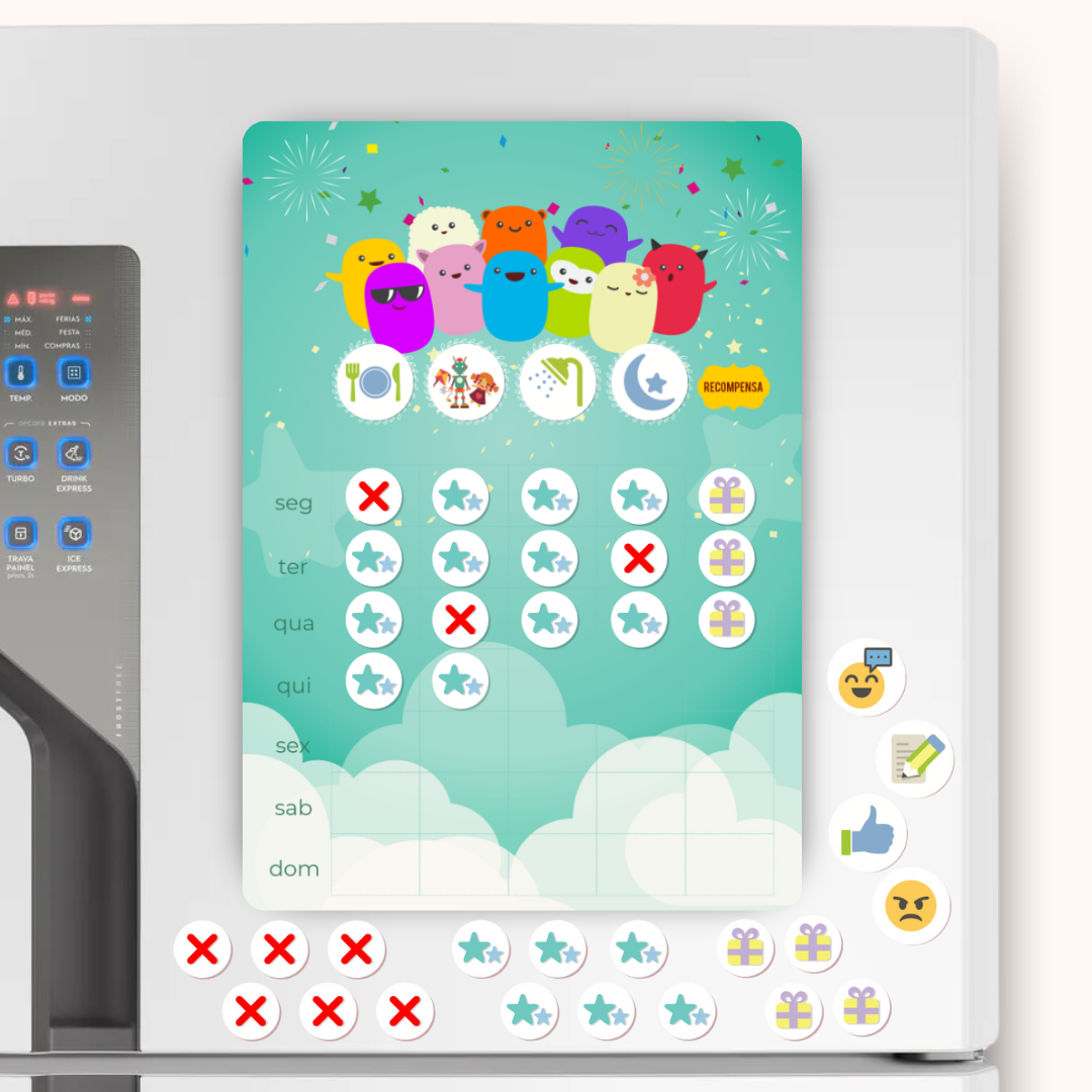 • Ímãs temáticos: Inclui peças divertidas para marcar atividades, metas e conquistas, incentivando a criança de forma visual.