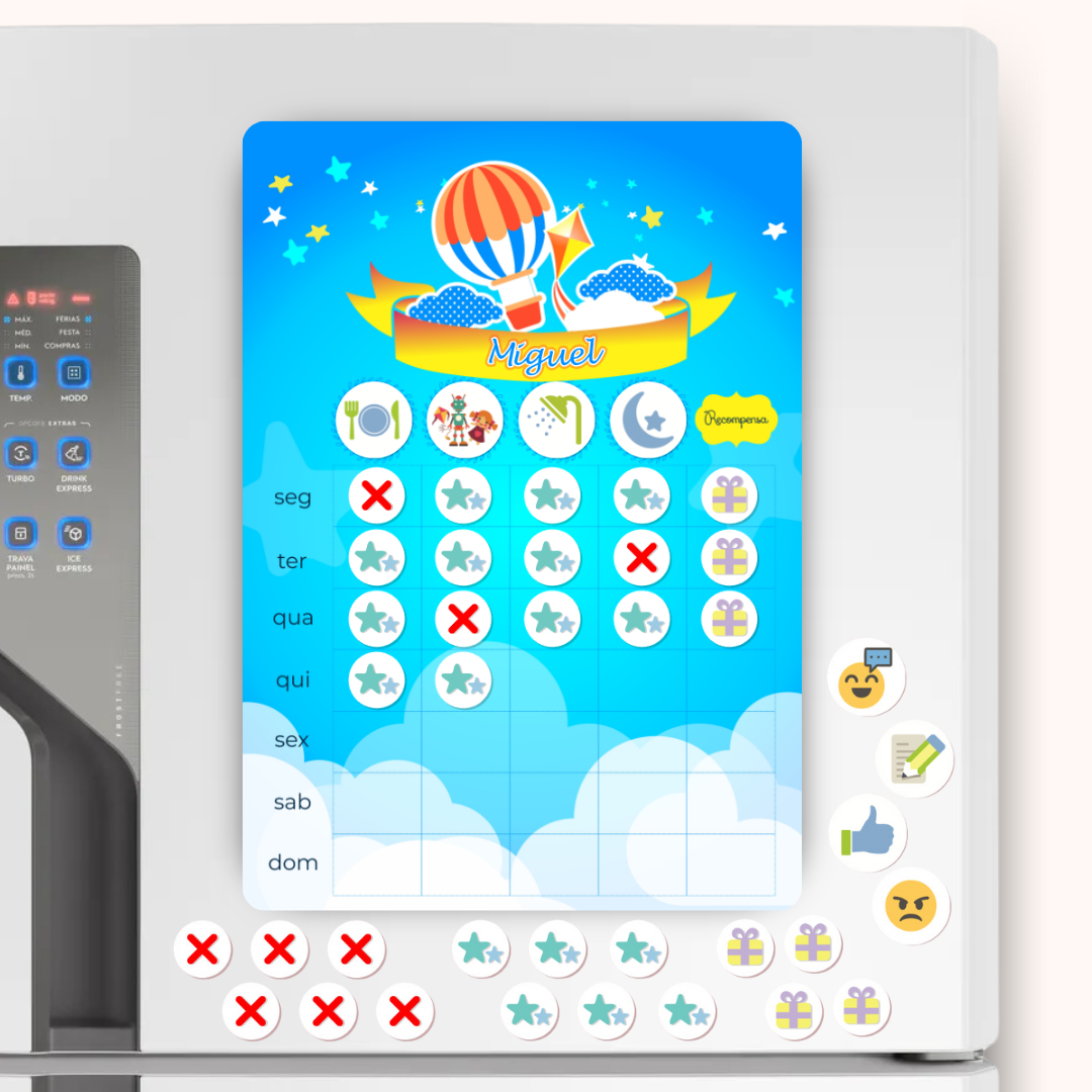 • Ímãs temáticos: Inclui peças divertidas para marcar atividades, metas e conquistas, incentivando a criança de forma visual.