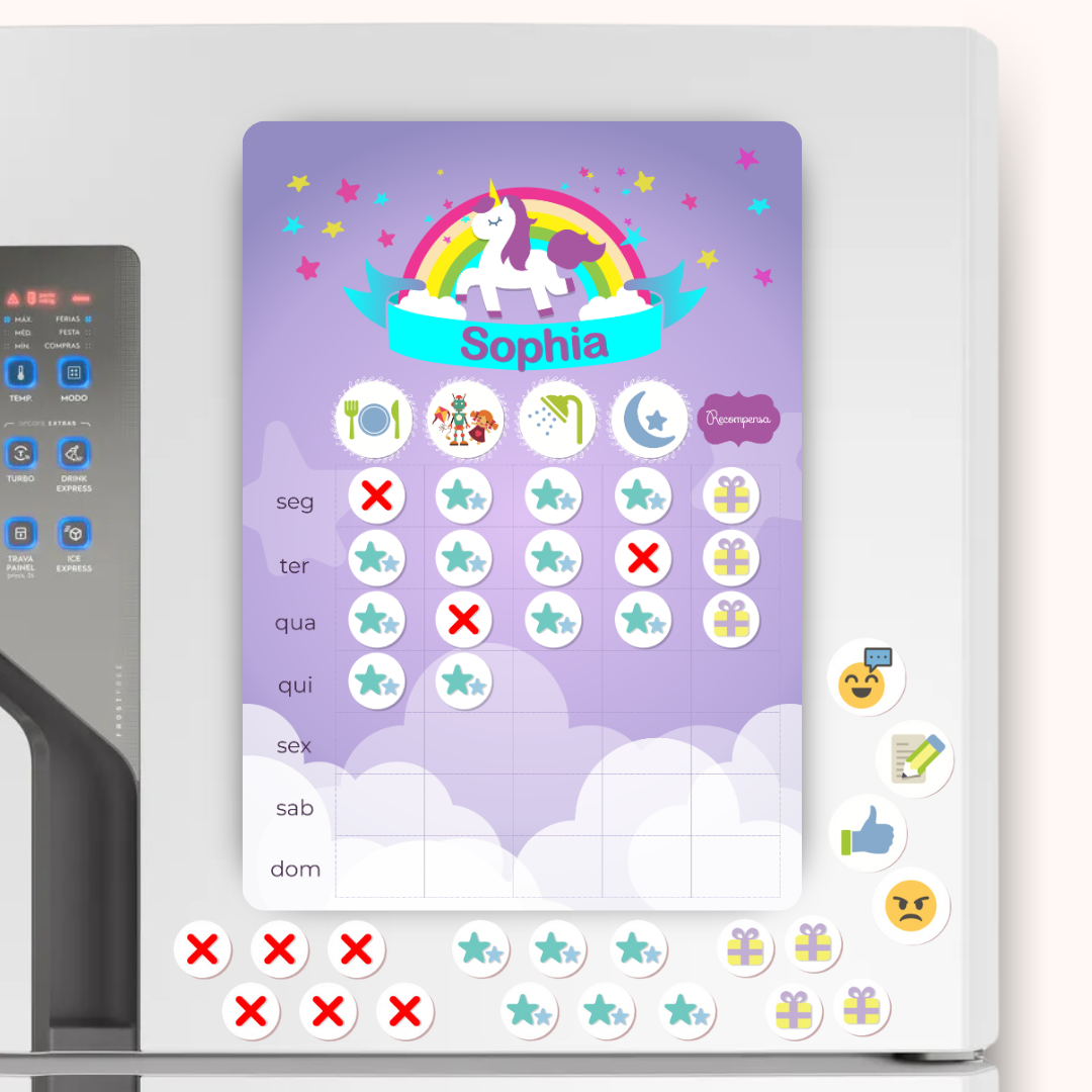 • Ímãs temáticos: Inclui peças divertidas para marcar atividades, metas e conquistas, incentivando a criança de forma visual.