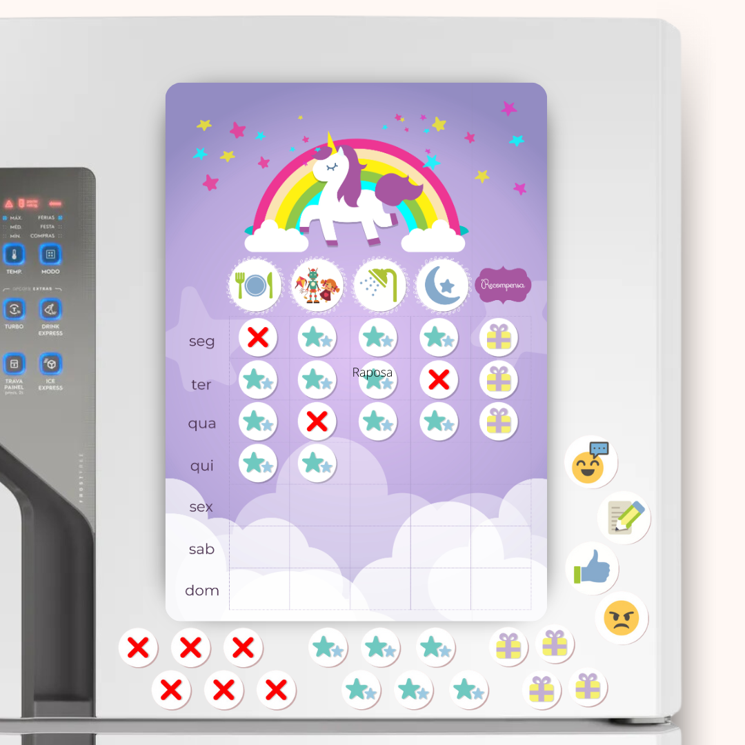 Ajude sua criança a desenvolver hábitos saudáveis e cumprir tarefas de maneira divertida com o nosso Quadro de Incentivo Magnético! Ideal para estimular a responsabilidade e o bom comportamento, este quadro torna a organização da rotina diária uma experiência lúdica e interativa.